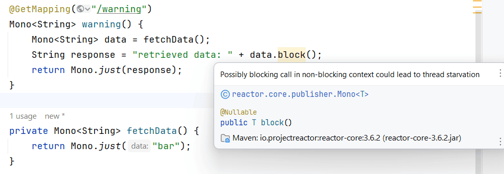 IntelliJ IDEA 在我們嘗試在反應式上下文中執行阻塞操作時,會發出“可能在非阻塞上下文中執行阻塞調用可能導致線程飢餓”警告。