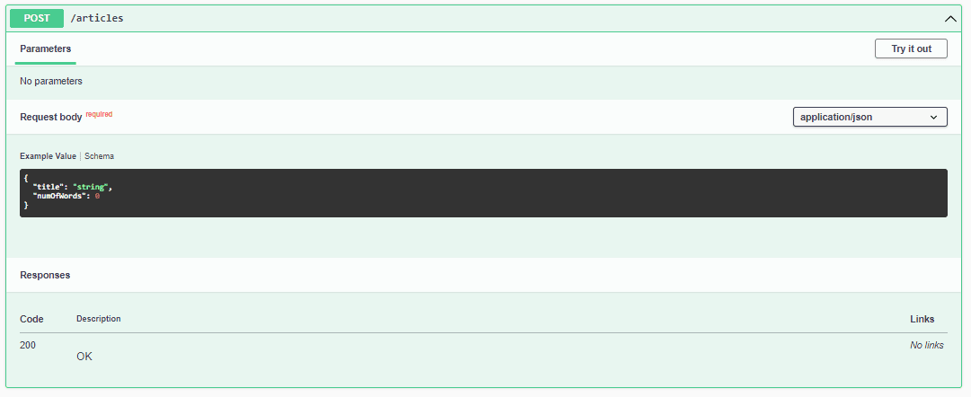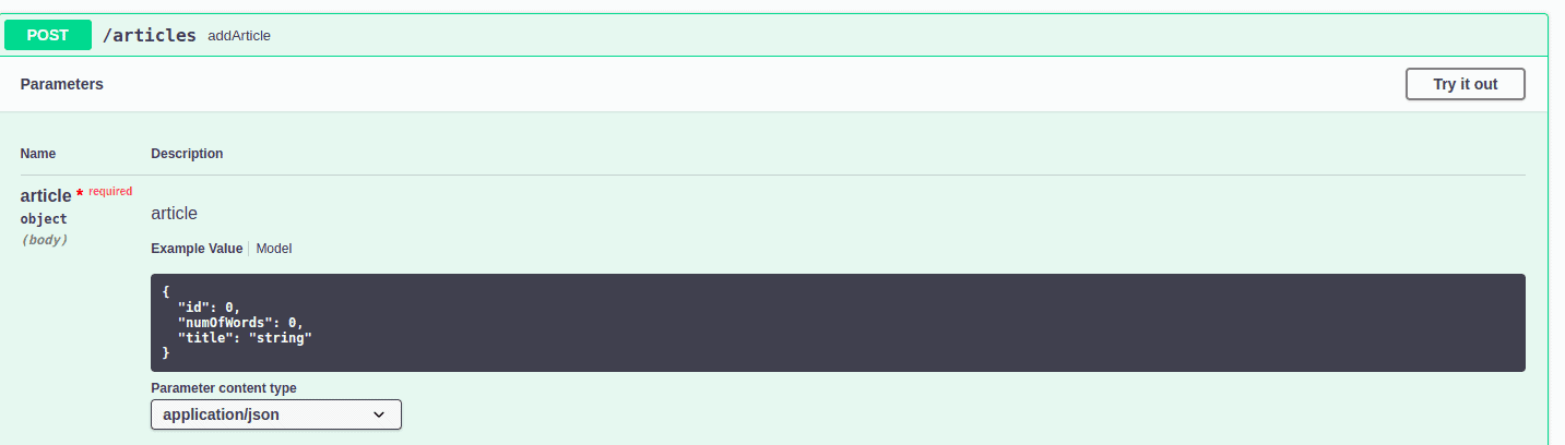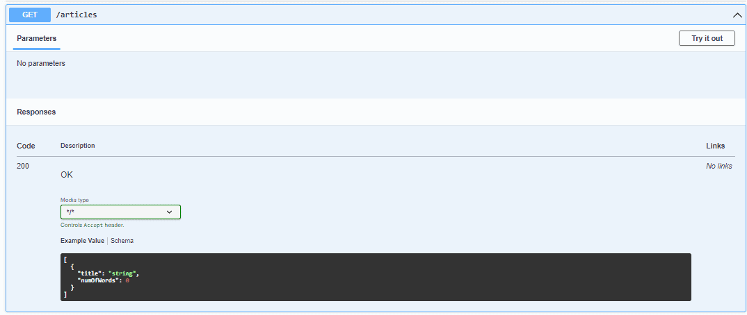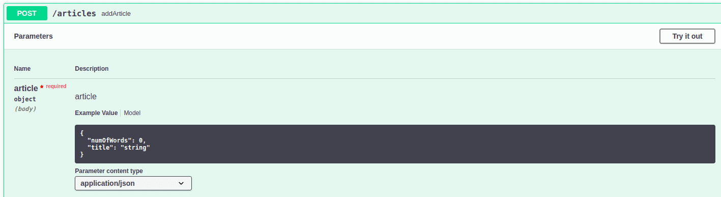 在 POST API 中,我們接受所有詳細信息,包括 id、title 和 numOfWords 等字段,這些信息來自用户。在 GET API 中,我們返回相同字段,這些字段在響應中。我們可以看到,默認情況下,Swagger 顯示了所有字段,對於這兩個 API 而言。