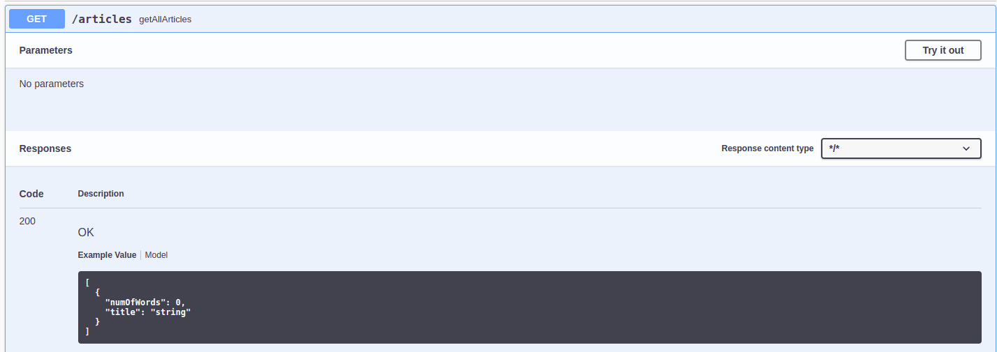 我們可以通過 http://localhost:9090/springbootapp/swagger-ui/index.html#/articles-controller 訪問 Swagger UI。讓我們運行應用程序並查看以上兩個 API 的默認行為:
