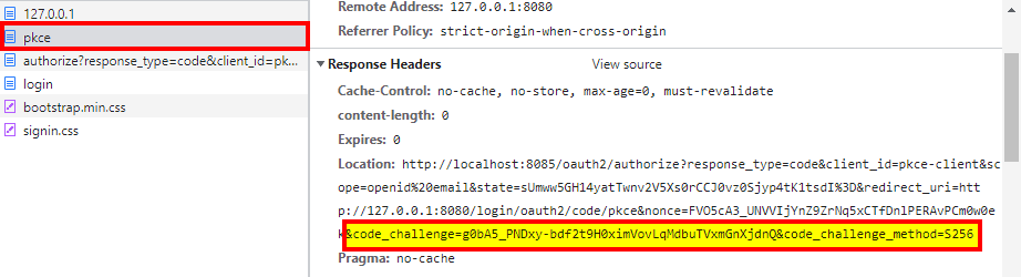 我們可以看到 PKCE 參數在客户端應用程序生成響應的 Location 標頭中存在,該響應針對 `http://127.0.0.1:8080/oauth2/authorization/pkce 的請求: