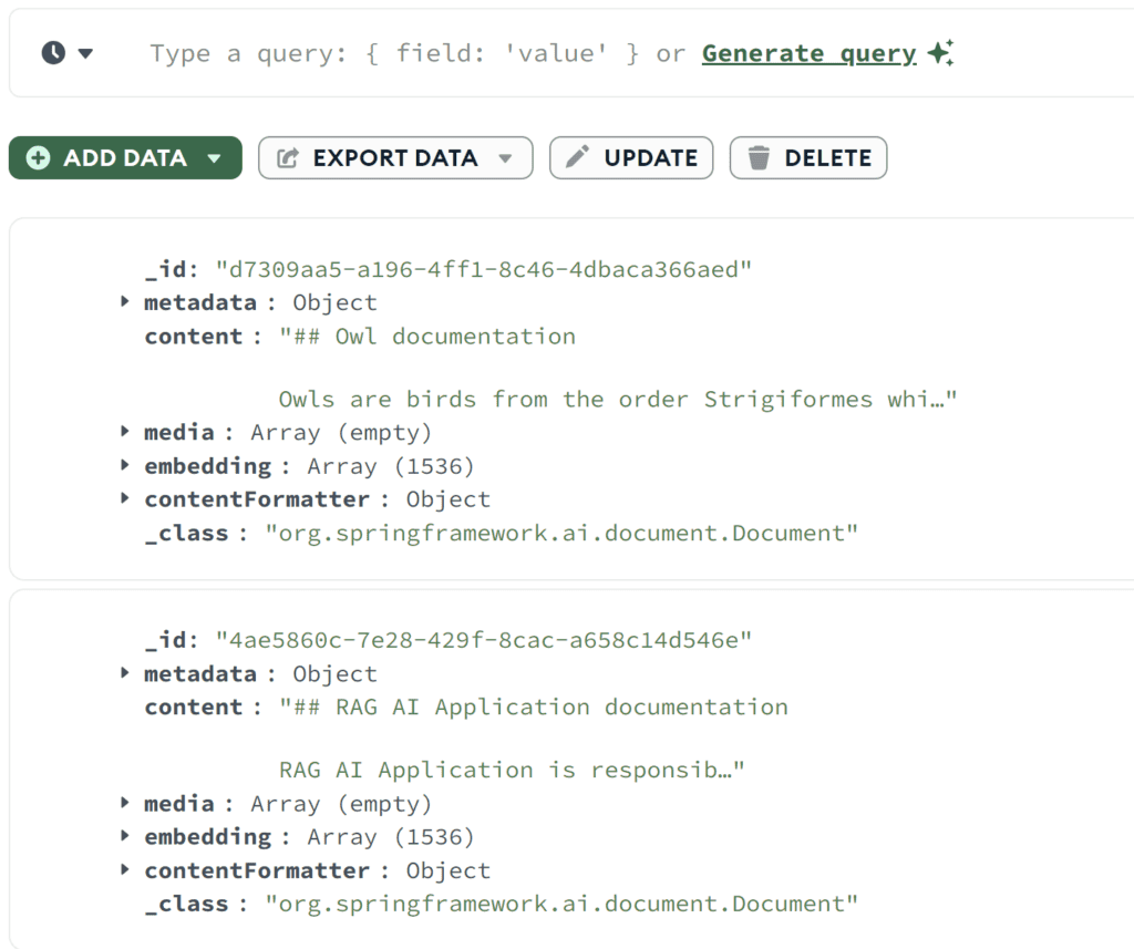 model: gpt-3.5-turbo我們已指定 MongoDB URL 和數據庫,並已通過設置集合名稱、嵌入字段名稱和向量索引名稱配置了我們的向量存儲。多虧了 initialize-schema 屬性,所有這些 Artifacts 將由 Spring AI 框架自動創建。