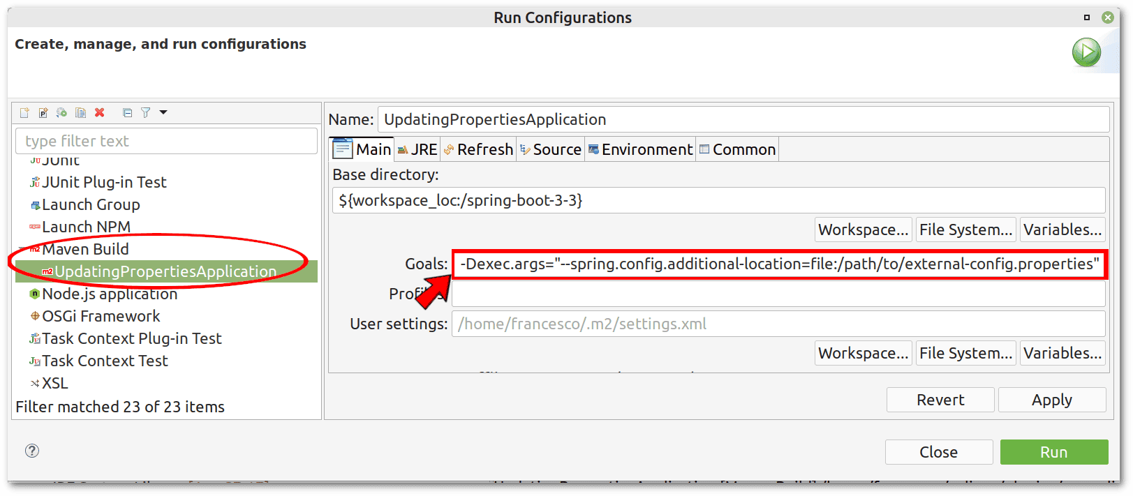 my.custom.property=externalValue我們可以通過使用 –spring.config.additional-location</em/> 參數來告知 Spring Boot external-config.properties</em/> 的位置,如以下 Eclipse 截圖所示。請務必將示例 /path/to/</em/> 替換為實際路徑。