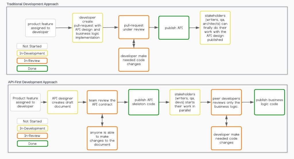 為了充分理解 API-優先方法的優勢,我們將比較兩支敏捷團隊的工作流程場景。 第一支團隊使用傳統方法,而第二支團隊使用 API-優先開發:
