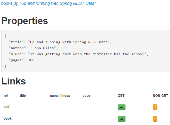 嵌入式資源顯示我們端點 /books 上單個圖書記錄的詳細信息。每個資源還包含其自身的屬性和鏈接 部分:
