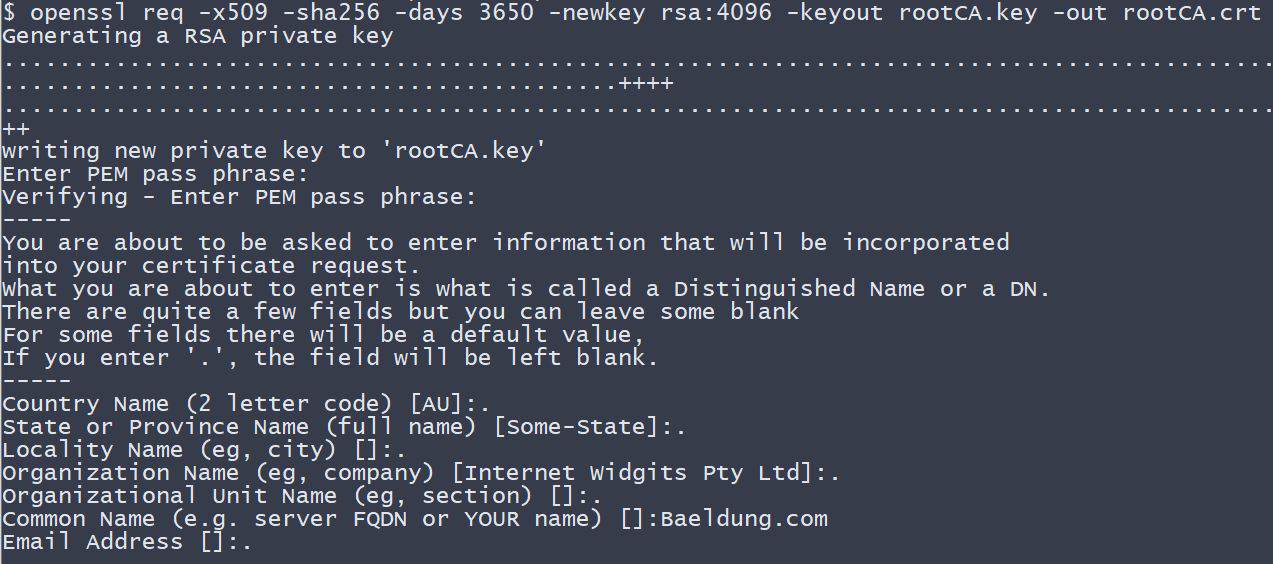 此外,我們需要輸入構成所謂的“區別名”的信息。在這裏,我們僅提供 CN(通用名)—— Baeldung.com —— 並留其他部分為空。