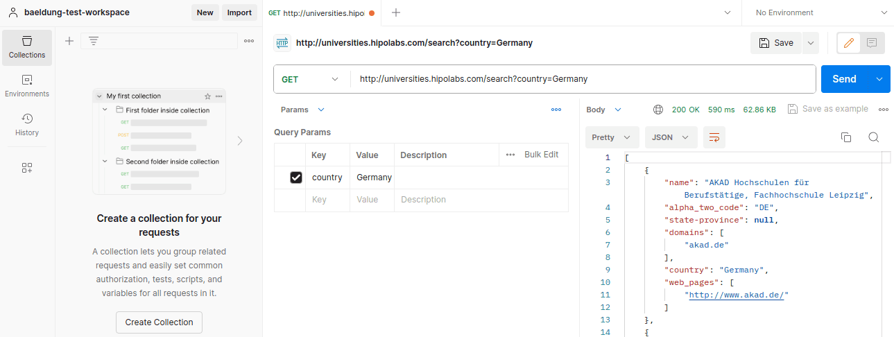 為了在 Postman 中測試發送請求,我們將 URL 設置為 http://universities.hipolabs.com/search?country=Germany,並將方法設置為 GET: