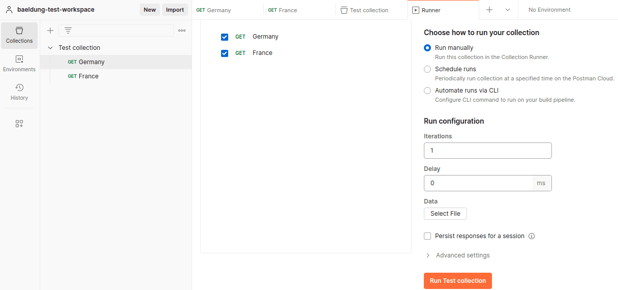 我們將重點關注通過利用 收集器 執行我們的收集 (collection)。 在這裏,我們可以以特定順序運行我們的請求,手動、按計劃或從命令行運行。 這種方式可以測試我們的 API 的功能性。 儘管如此,收集器 還允許我們通過模擬真實世界的流量場景來測試我們的 API 的性能。