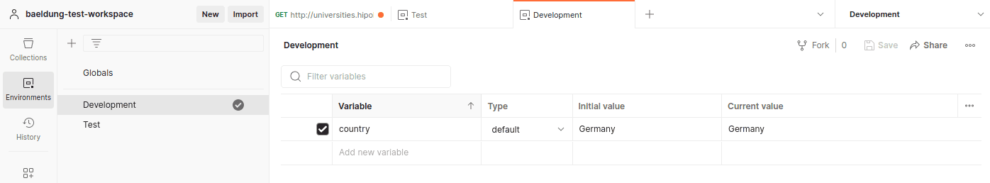 我們將在每個環境中創建一個名為 country 的變量,為開發環境分配值為“Germany”,為測試環境分配值為“France”: