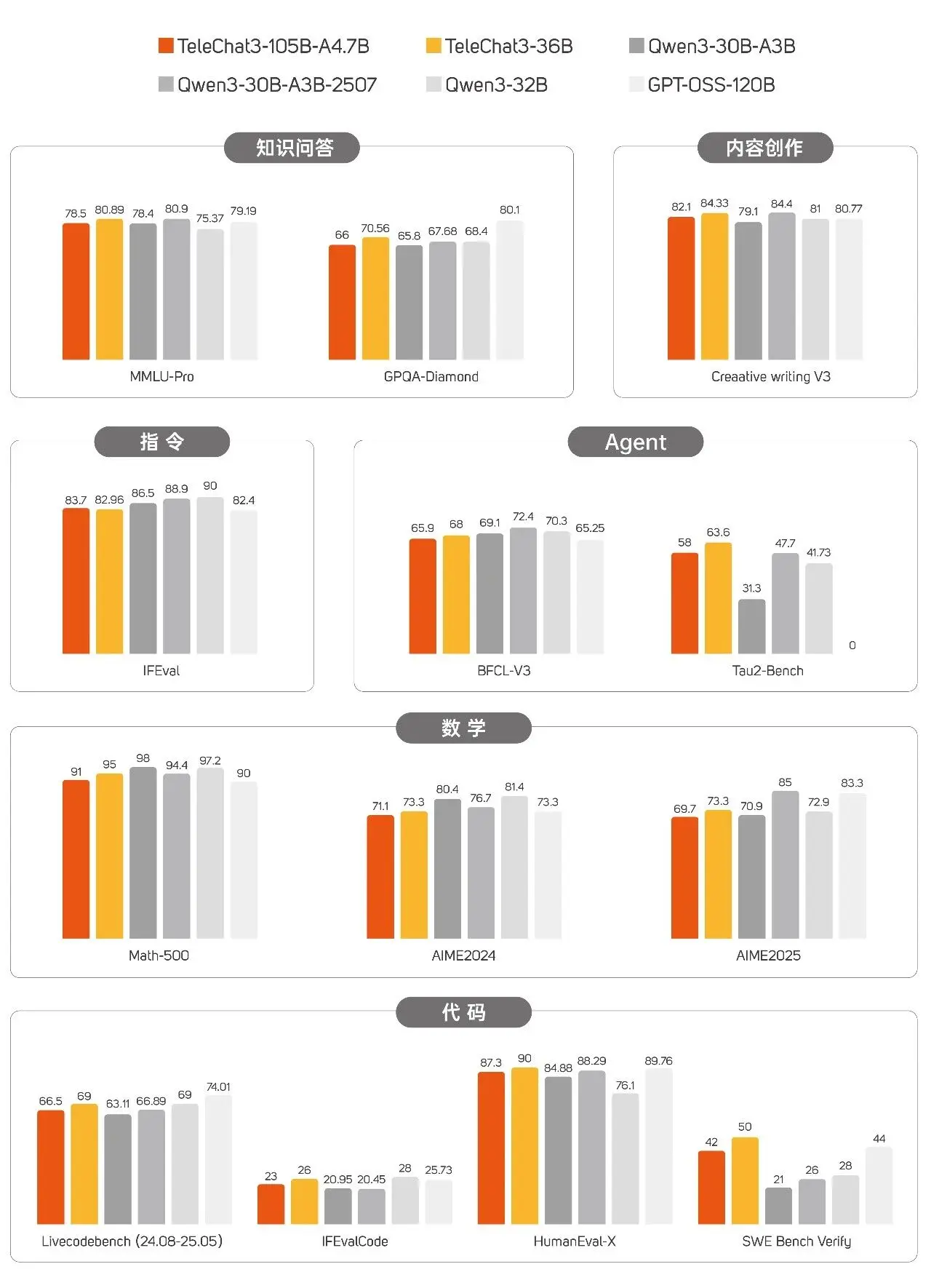 據介紹,該系列模型完全基於國產算力(上海臨港國產萬卡算力池)訓練,基礎數據量達 15T tokens。TeleChat3 全系支持 Thinking 思考模式,通過在 chat template 中加入特定引導符號生成推理過程,在知識、數學、創作、代碼、Agent 及指令遵循等 六 個維度均比肩業內頭部模型。