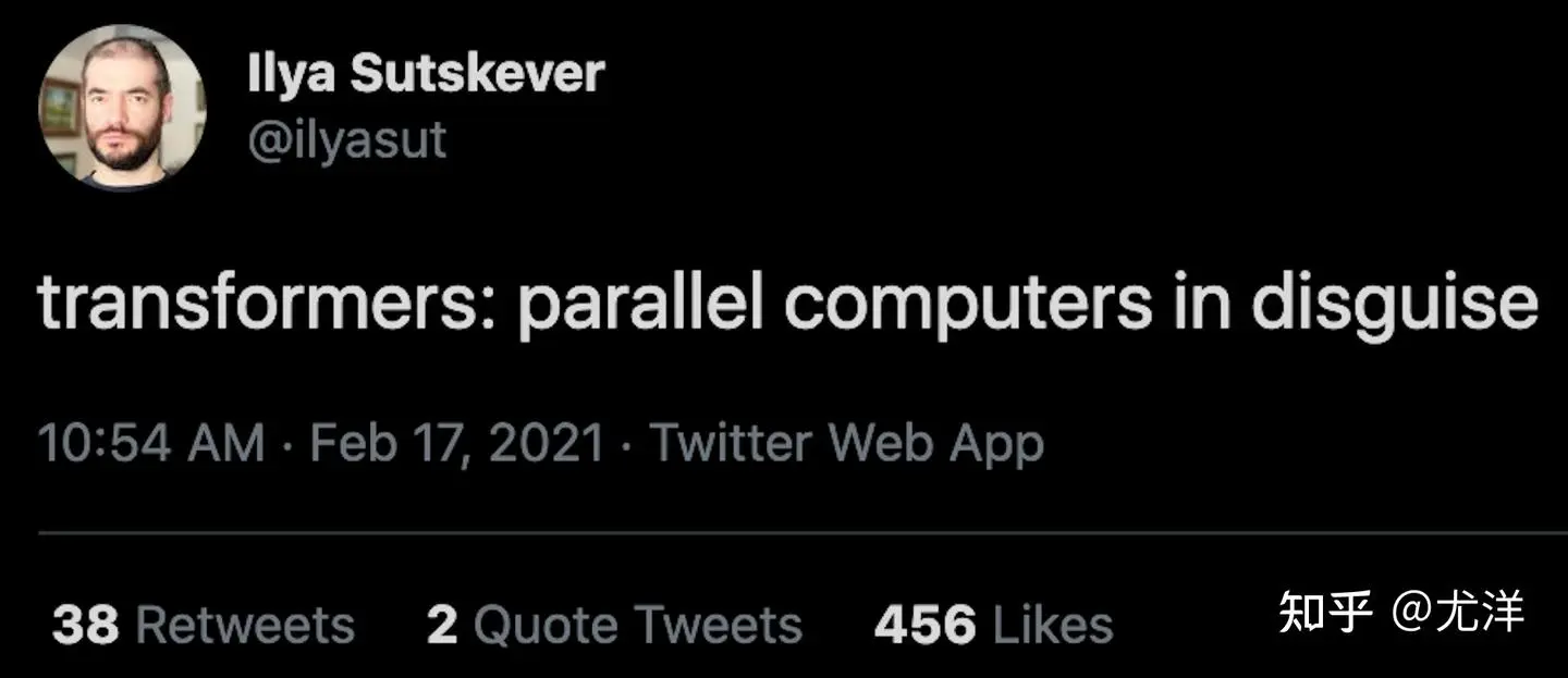 那為什麼 Transformer 率先脱穎而出?因為 Transformer 也是一台並行計算機。這裏我引用一下 Ilya Sutskever 的一句話:“Transformers: parallel computers in disguise”,直白的意思是:Transformer 本質上是一個被神經網絡外殼包裹起來的並行計算機。這也是 Transformer 最先能夠顯現智能的核心原因,因為它的並行計算特性完美匹配了 GPU 的並行計算單元。