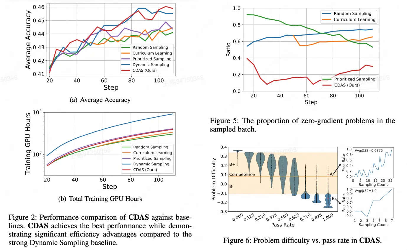 針對這些問題,本文提出了 CDAS(Competence-Difficulty Alignment Sampling):一種將模型能力與問題難度顯式建模並對齊的動態採樣方法。CDAS 不依賴單步通過率,而是通過累積歷史表現差異來構建更穩定的難度估計;同時定義模型能力,並以不動點系統確保兩者在訓練過程中共同收斂。基於能力---難度差值構建對齊指標,再通過對稱採樣策略,選取最匹配模型當前能力的問題,從而提升有效梯度比例與訓練效率。CDAS 在數學推理和代碼生成場景中均通過 RL 訓練 驗證,結果顯示 CDAS 顯著提升了採樣效率與模型性能,擊敗了多種主流採樣策略。