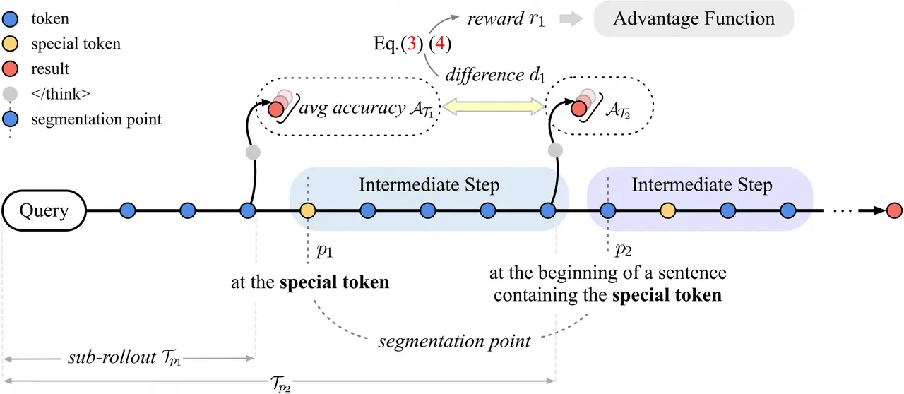 論文簡介:大推理模型通過強化學習提升了鏈式推理能力,但輸出冗長,導致推理開銷增大和用户體驗下降,即「過度思考」問題。針對這一現象,本文提出了可驗證的過程獎勵機制(VSRM),通過獎勵有效步驟、懲戒無效步驟,優化模型推理過程。VSRM首先通過特殊token劃分推理步驟,並結合三條規則保證每個步驟的內容可讀性。各步驟通過插入token生成子軌跡,模型根據每步前後正確率變化分配步驟級獎勵。為避免獎勵信號稀疏,引入前瞻窗口機制,通過折扣因子傳播未來正確率變化,使獎勵更密集。