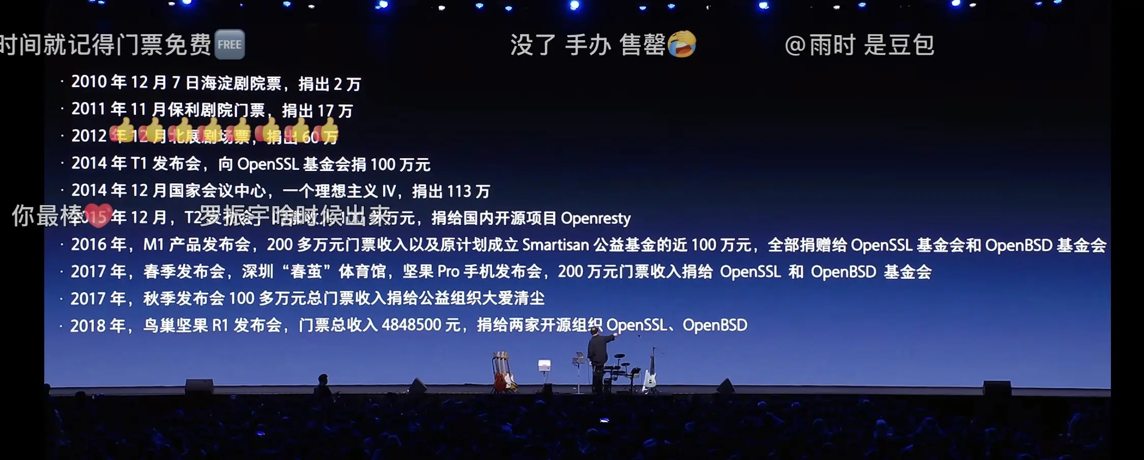 - 春季發佈會(推出堅果Pro):門票收入約110萬-200萬元,全額捐贈給OpenSSL基金會和OpenBSD基金會,延續開源社區捐贈傳統。