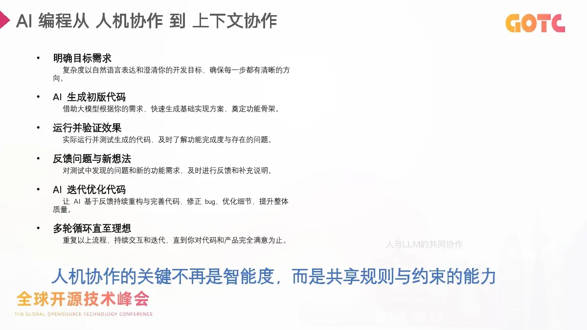 這場演講沒有推銷任何工具,它把兩年來從 SpecKit、OpenSpec 到 CodeBuddy 等開源實踐踩過的坑,抽象成三段可落地的範式升級:人機協作、上下文協作、規約協作。