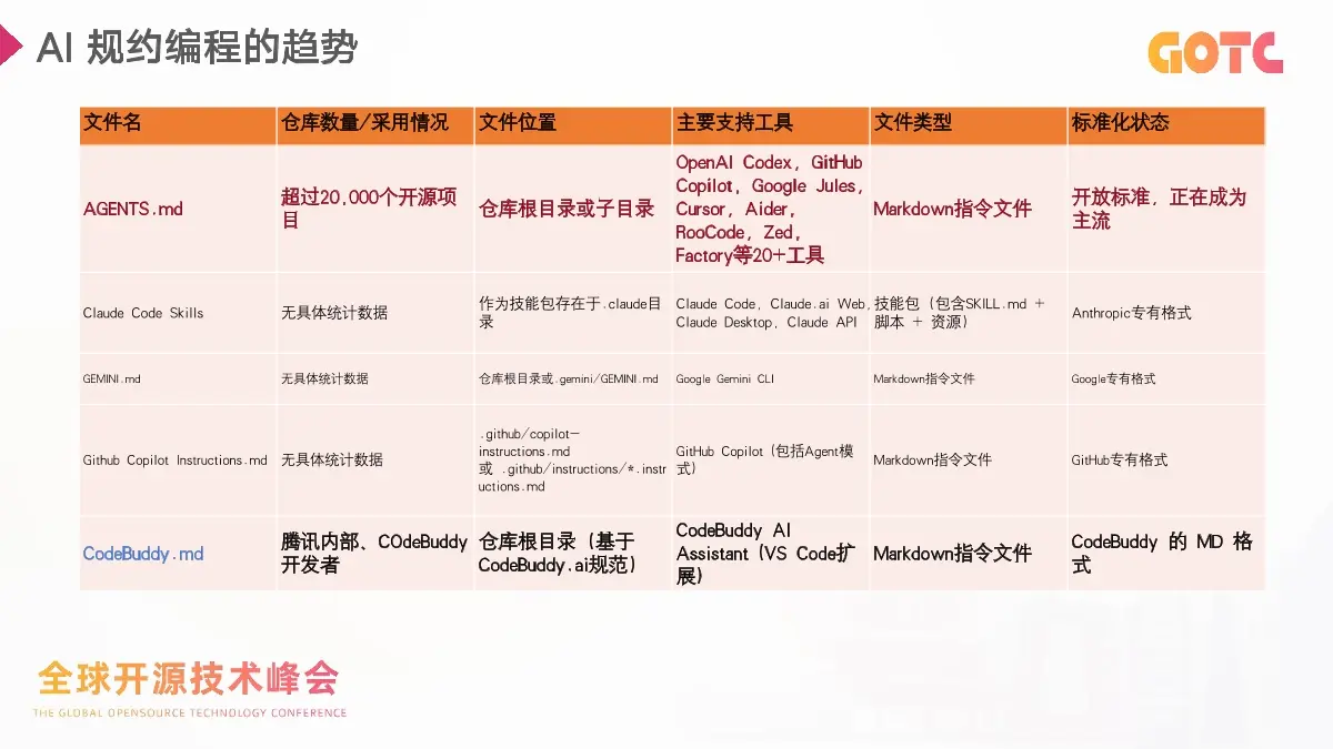 演講裏還公開了主流模型與 IDE 正在共同收斂的“AI 指令層”事實標準:從 AGENTS.md、Claude Code Skills 到 GitHub Copilot Instructions,規約文件已經像 CI 腳本一樣成為倉庫默認資產。