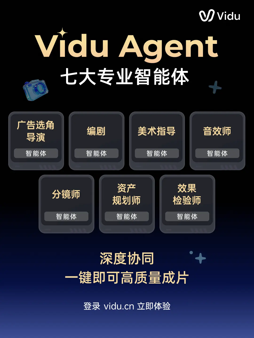 據介紹,Vidu Agent 背後是一套成熟的多智能體(Agent)協同生產體系。目前,Vidu 已集成 7 個專業 AI 智能體,分別承擔腳本規劃、分鏡設計、素材編排、視覺生成、配音配樂、節奏剪輯與整體質量控制等關鍵角色,協同構成一條高效的視頻廣告生產流水線。