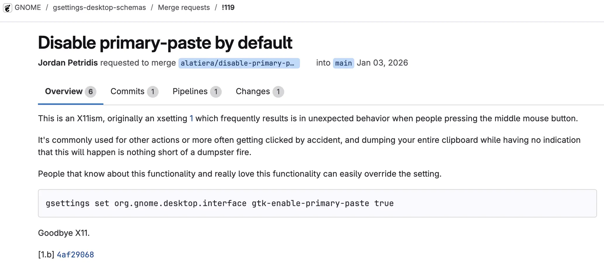 提議作者指出,中鍵粘貼作為“一個來自 X11 的遺留行為”,在當代桌面環境中往往令人困惑 — 用户可能無意按下中鍵,導致剪貼板內容意外被插入,而界面沒有任何提示。