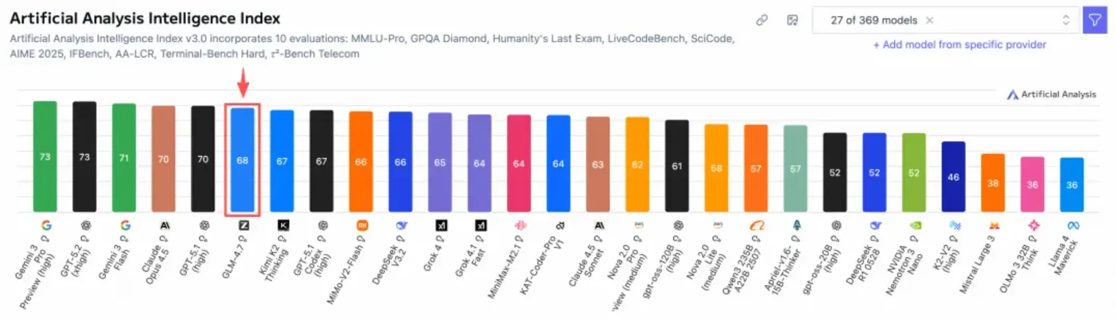 智譜發文宣佈,GLM-4.7 在全球知名的權威大模型評測榜單 Artificial Analysis Intelligence Index(AA 智能指數)中,以 68 分綜合成績榮登開源模型與國產模型雙料榜首、全球第六。