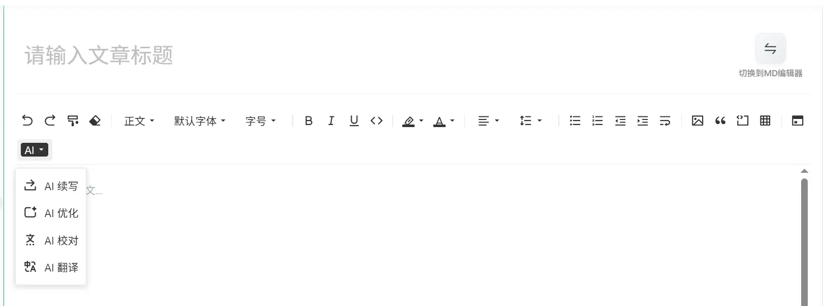 目前,智寫平台已深度集成 DeepSeek、Qwen 以及 GLM 等主流大模型,用户可根據創作需求或偏好在多個模型間靈活切換。平台界面設計簡潔直觀,操作流程簡單易用;同時支持 MD 編輯器與富文本編輯器的雙模式切換,滿足多樣化編輯習慣。
