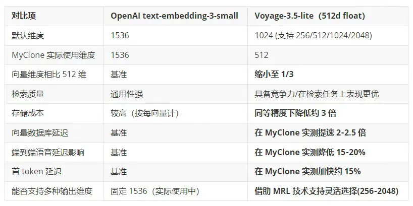 文章重點介紹了 MyClone 將原有 1536 維的 OpenAI text-embedding-3-small 模型替換為 512 維的 Voyage 3.5 Lite 嵌入模型,從而實現 RAG 延遲與存儲成本的大幅降低,還能在保持甚至提升檢索質量的同時,明顯改善用户體驗。