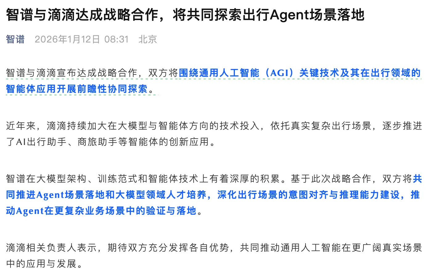 智譜與滴滴正式宣佈達成戰略合作。雙方表示,將重點在以下方向深化合作: