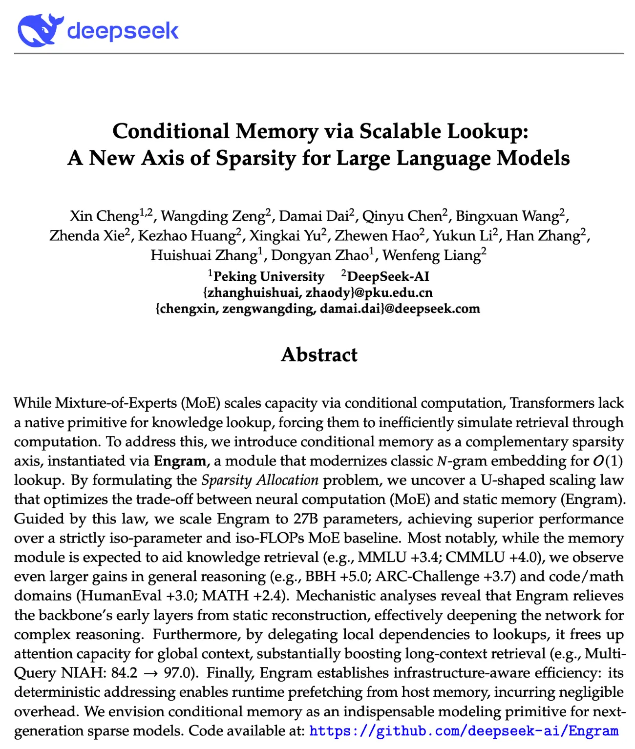 DeepSeek 團隊發佈新論文《Conditional Memory via Scalable Lookup: A New Axis of Sparsity for Large Language Models》,提出了可擴展的“查找式記憶”,為大模型提供了區別於傳統 Transformer 與 MoE 的全新稀疏性維度。