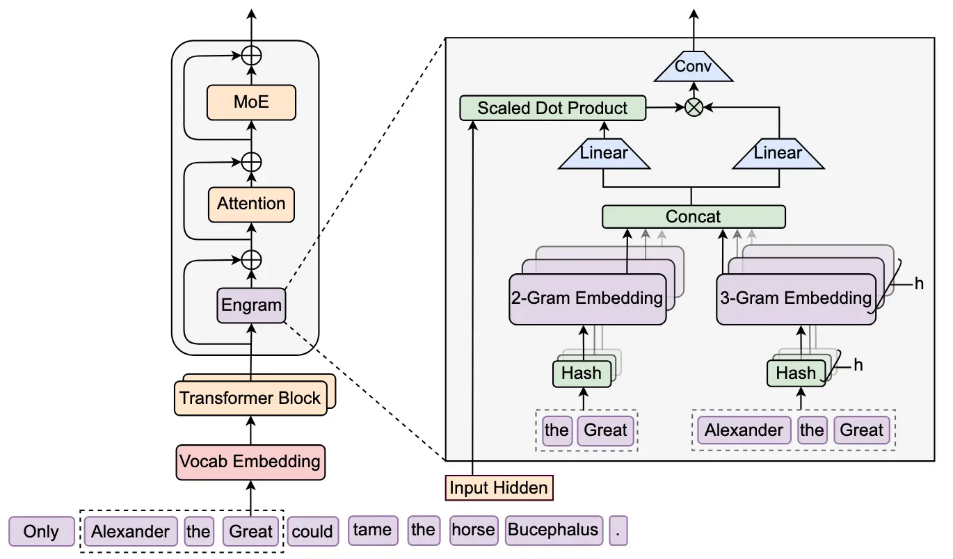 Engram 的核心機制是基於現代化哈希 N-Gram 嵌入的 O(1) 查找式記憶。模塊會對輸入 Token 序列進行 N-Gram 切片,並通過多頭哈希映射到一個規模可擴展的靜態記憶表中,實現常數時間的檢索。