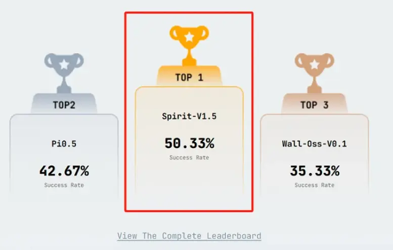 千尋智能 Spirit v1.5 在具身智能模型評測平台 RoooChallenge 最新榜單中取得了世界第一的排名,成功超越 Pi 0.5。