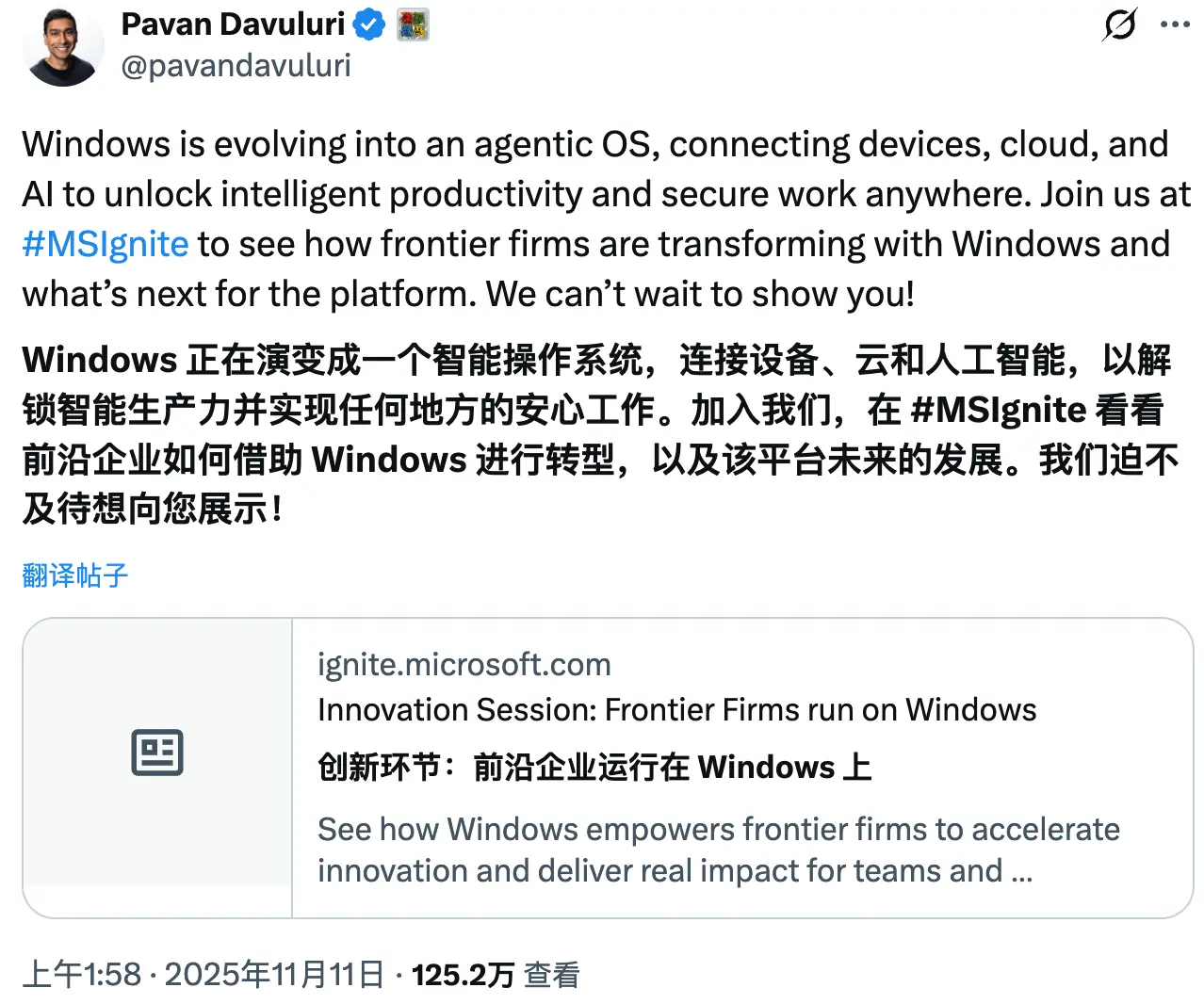 幾天前,Davuluri 在 X(原Twitter)官方賬號上公開表達了對於即將召開的 Ignite 大會的期待,他表示將展示代理型操作系統的最新動態。Davuluri發文稱:“Windows 正在進化為代理型操作系統,連接設備、雲與 AI,釋放智能生產力並保障安隨地工作。”