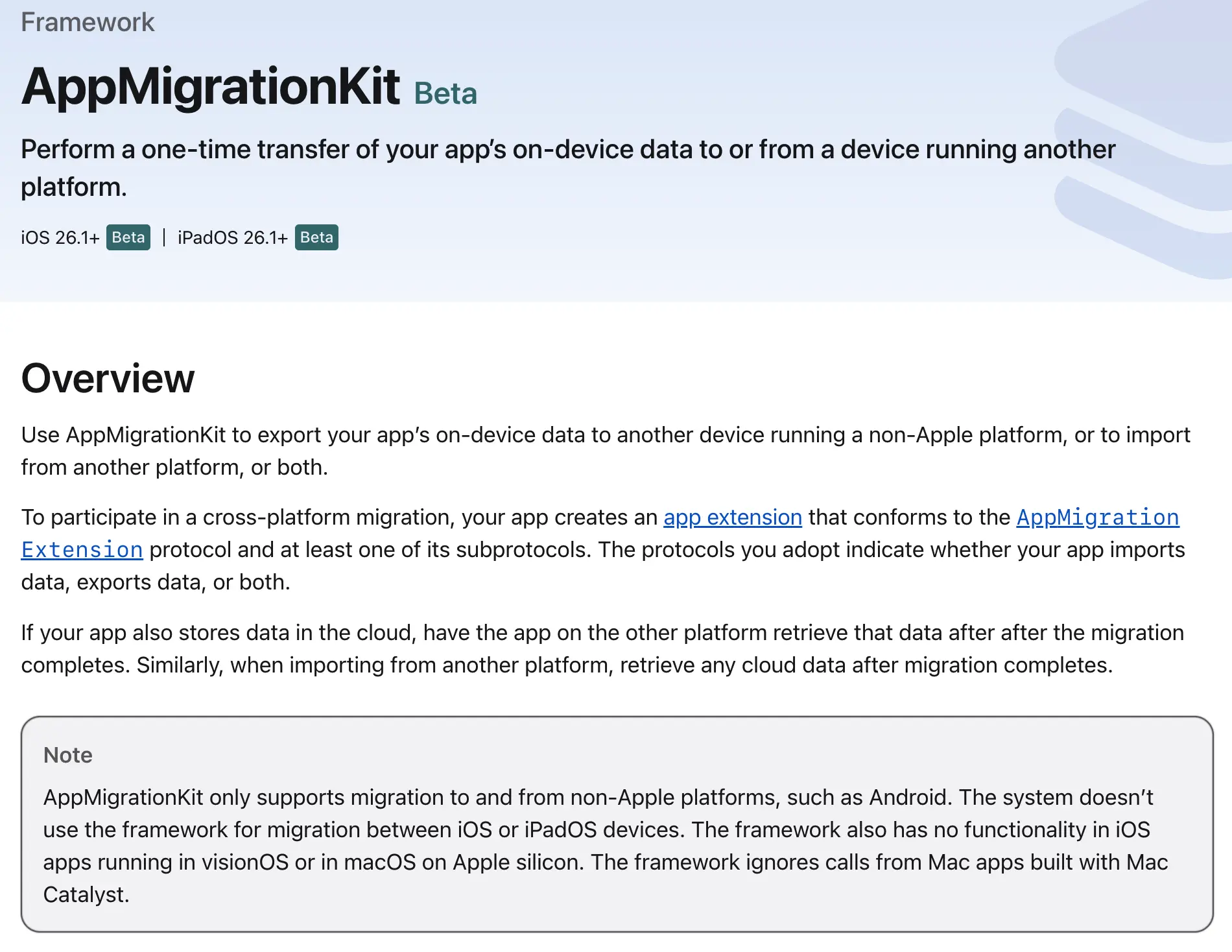 據介紹,AppMigrationKit 框架目前正處於開發階段,將兼容 iOS 26.1 和 iPadOS 26.1 及更高版本的設備。