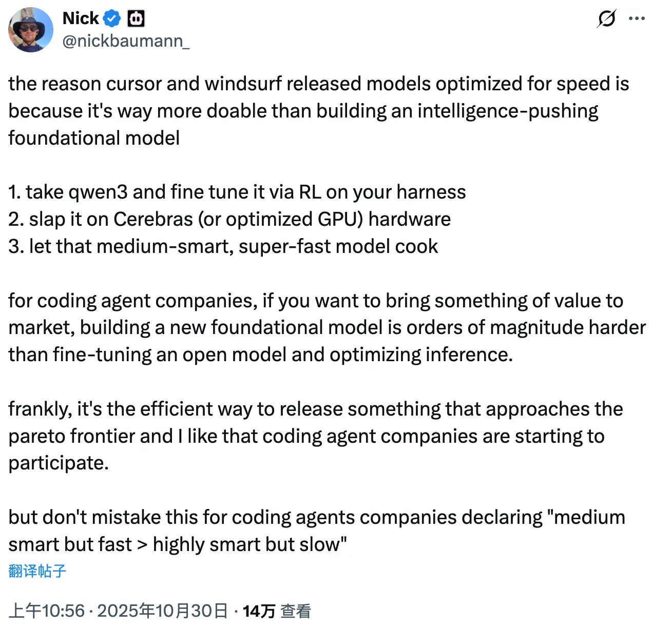 Cursor和Windsurf之所以發佈針對速度優化的模型,是因為這比構建一個追求極致智能的基礎模型(foundational model)要容易得多。