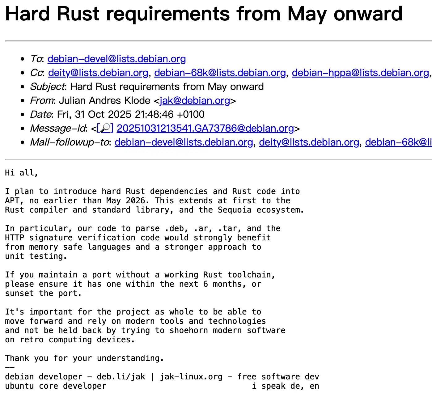 開發者被要求在公告發出後的“約 6 個月”內完成對應架構的 Rust 支持,否則該架構可能被標為“將終止支持”。