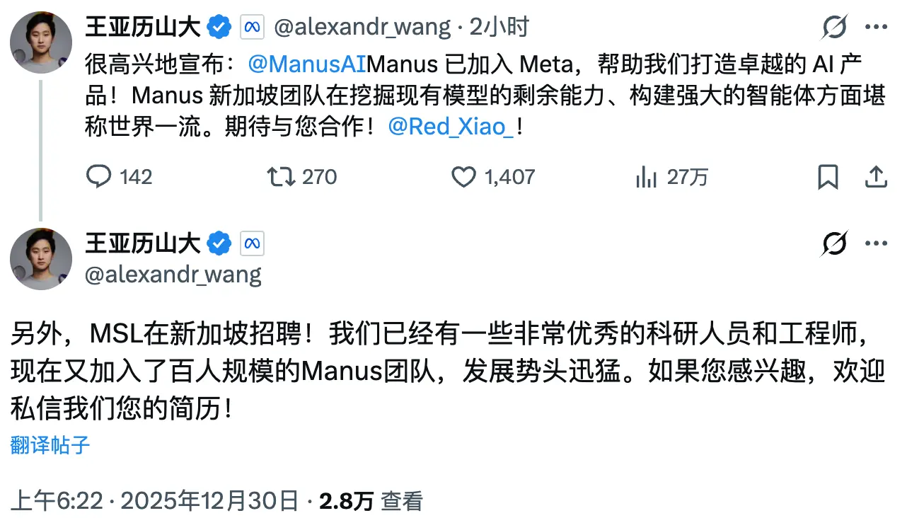 Meta 和 Manus 今日官宣:Manus 正式加入 Meta。