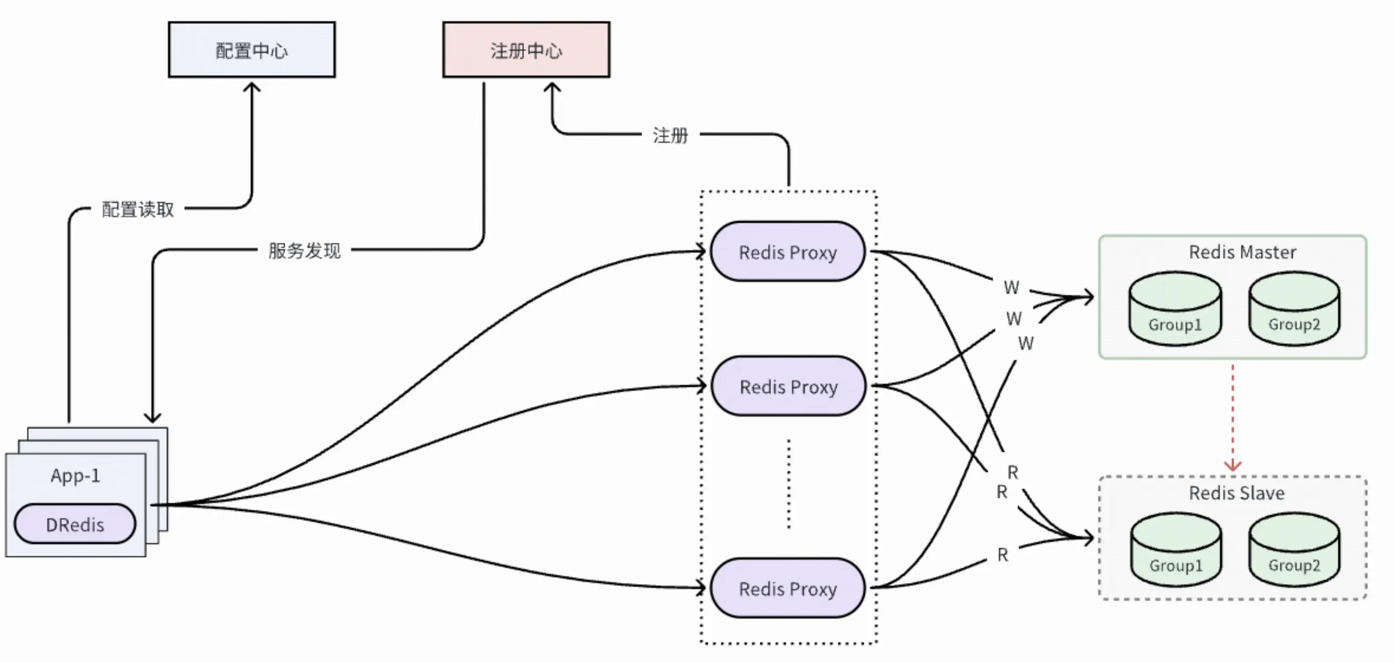 Redis-proxy 啓動並且獲取到集羣拓撲信息後,自動註冊到註冊中心;可通過管控白屏化操作向配置中心配置集羣使用的 proxy 分組與權重、就近讀規則等信息;DRedis SDK 啓動後,從配置中心獲取到 proxy 分組與權重、就近讀規則,從註冊中心獲取到 proxy 節點信息,然後與對應 proxy 節點建立連接;應用通過 DRedis SDK 訪問數據時,DRedis SDK 通過加權輪詢算法獲取一個 proxy 節點(默認優先同可用區)及對應連接,進行數據訪問。
