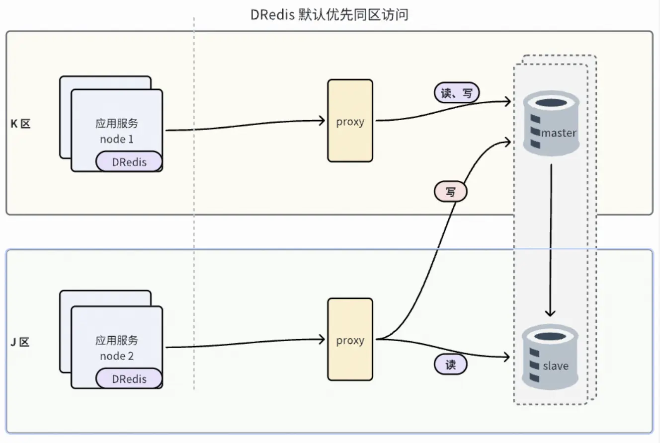自建 Redis 自研 DRedis SDK 設計之初便考慮了同城雙活就近讀需求,DRedis 訪問 proxy 時,默認優先訪問同區proxy。