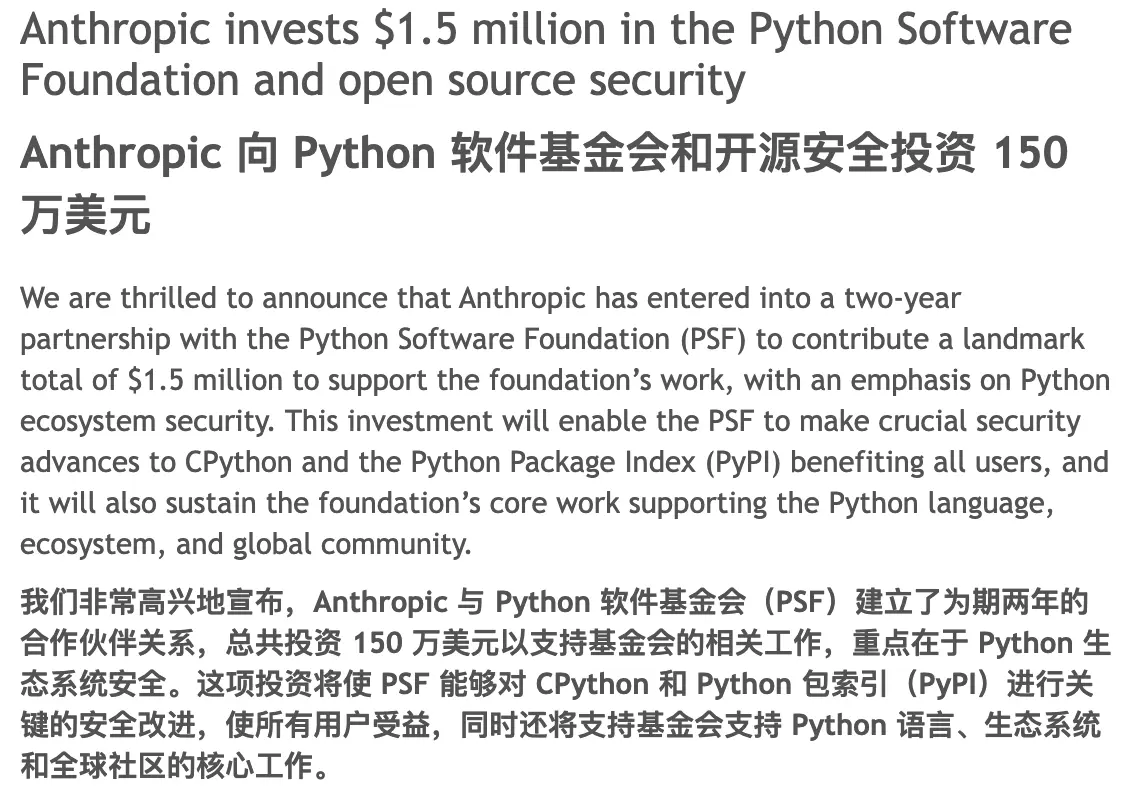 人工智能公司 Anthropic 宣佈與 Python Software Foundation(PSF) 建立為期兩年的戰略合作關係,向該基金會投入總計 150 萬美元資金,重點用於強化 Python 生態系統的安全性建設。
