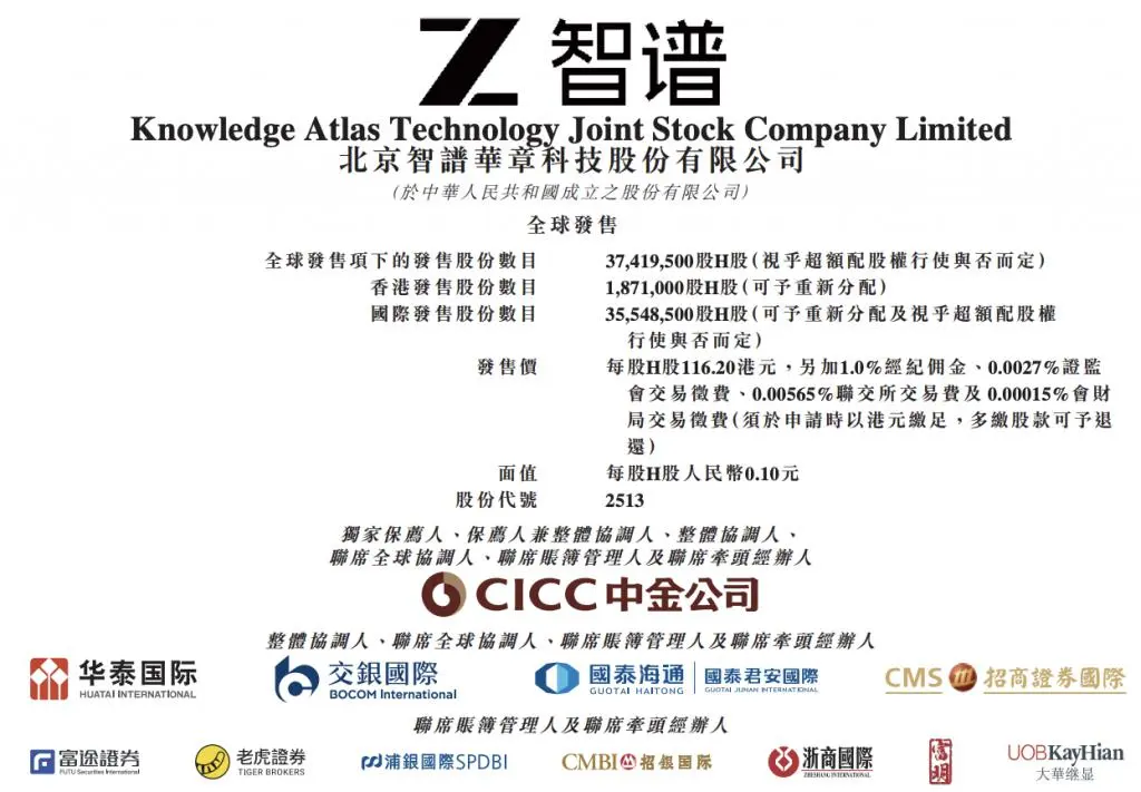 根據全球發售文件,智譜華章本次擬發行 3741.95 萬股 H 股,其中香港公開發售 187.1 萬股,國際發售 3554.85 萬股,發行價為每股 116.20 港元,預計募資總額達 43 億港元,對應 IPO 後市值超過 511 億港元。
