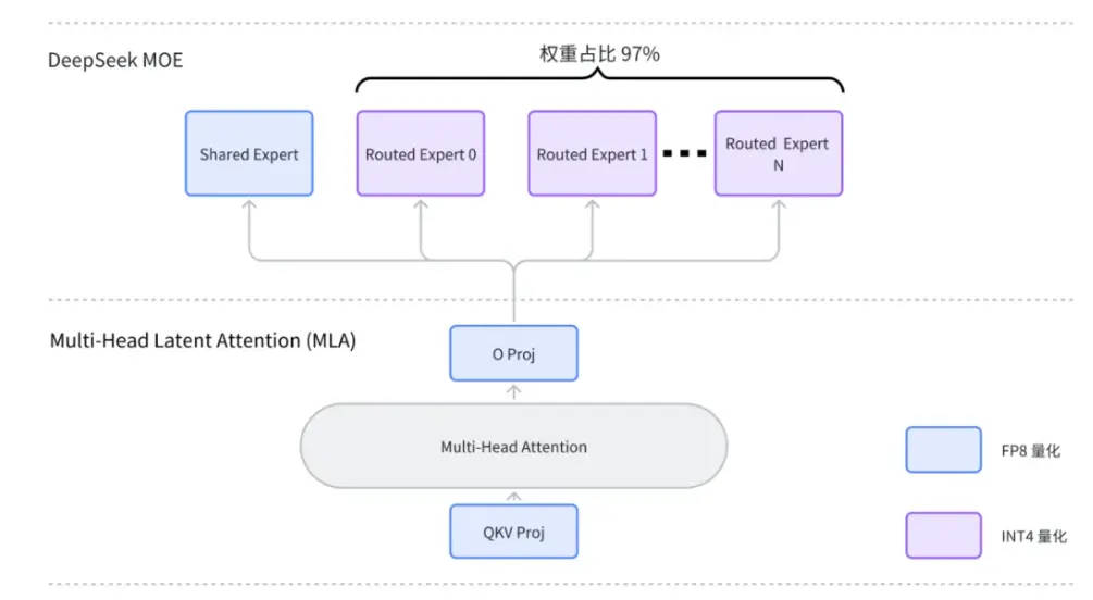 只對普通專家權重使用INT4量化,而對其他線性層保留DeepSeek原生的FP8量化方式;