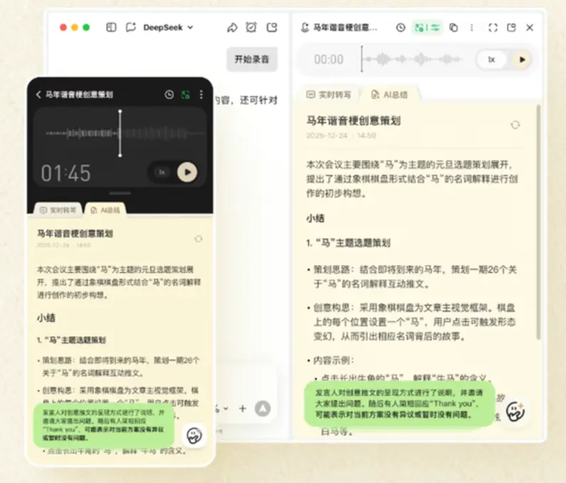 電腦版保留了手機端的主要功能,包括實時語音轉寫、AI內容總結和實時翻譯。在會議場景下,該功能可最小化窗口運行,在不遮擋屏幕的前提下提供實時轉寫文本與重點摘要。會議結束後,系統能自動區分不同發言人,生成條理清晰的會議記錄。