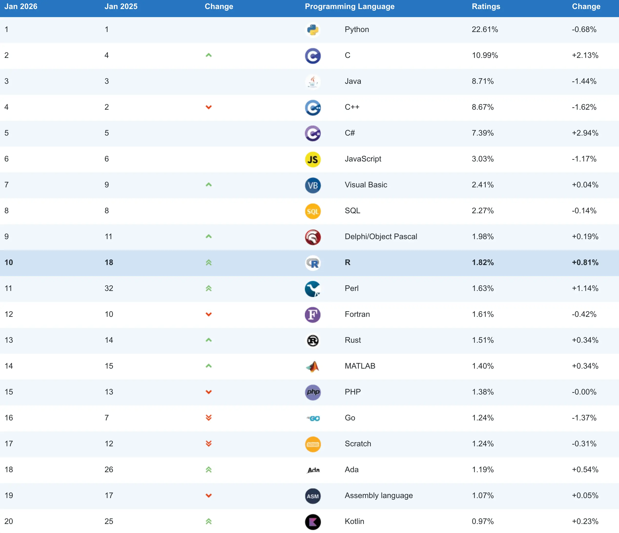 那麼,除了 C# 之外,2025 年的其他贏家是誰?Perl 出人意料地強勢迴歸,從第 32 名躍升至第 11 名,重新進入前 20。另一門重返前十的語言是 R,這主要得益於數據科學和統計計算領域的持續增長。