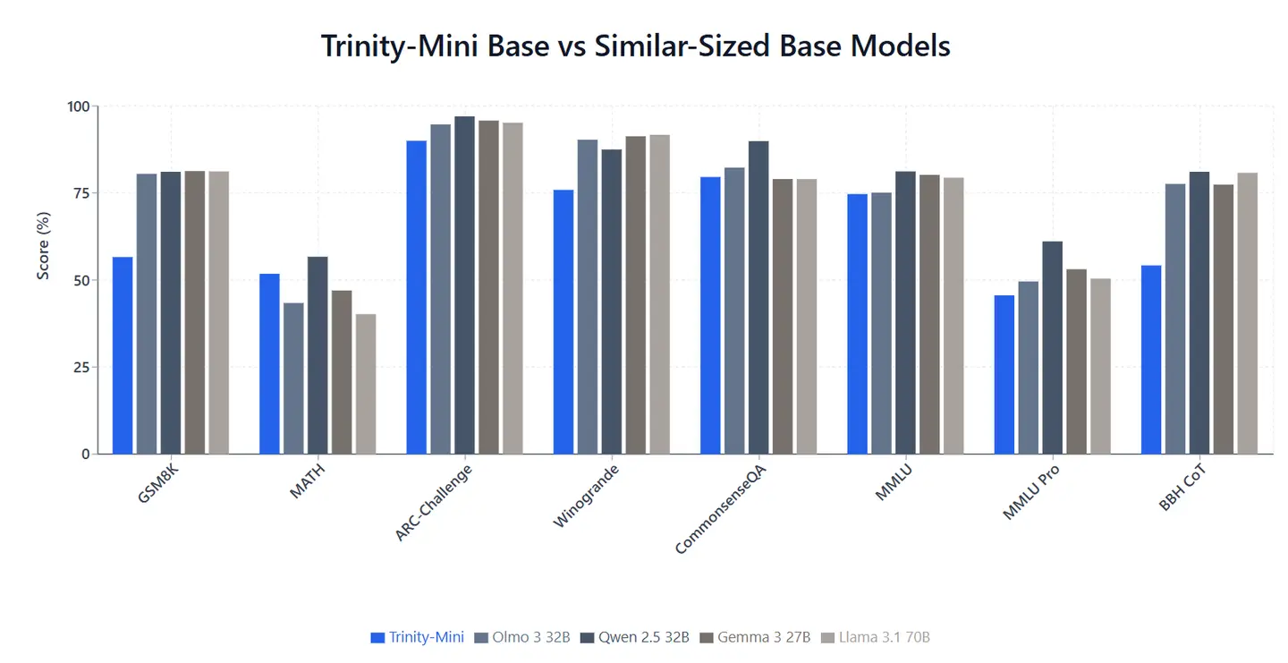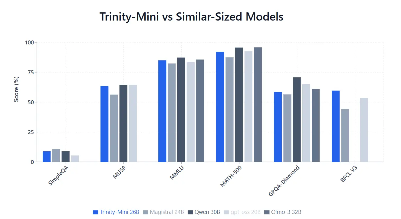 Trinity Mini:26B 參數 MoE(3B active),面向雲或本地機房,適用於多步推理、工具調用、長文本處理等任務。