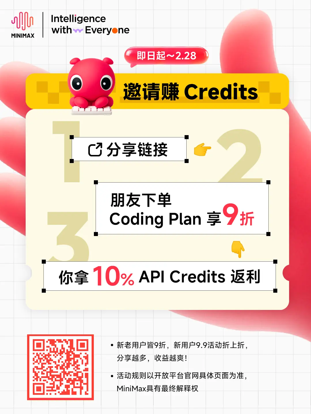 同時,MiniMax 還推出了 Coding Plan 好友邀請活動,活動時間為 2025 年 12 月 26 日至 2026 年 2 月 28 日。該活動採用雙向獎勵模式,邀請人需為 MiniMax 開放平台 Coding Plan 的有效訂閲用户,受邀人通過邀請鏈接購買可在結算時享受 9 折優惠。此優惠適用於 Coding Plan 全場套餐訂閲及訂閲升級,並可與 9.9 元 Starter 月度套餐首購優惠活動疊加。
