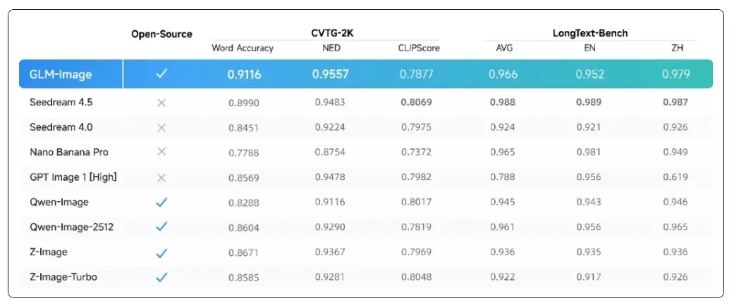 評測結果顯示,GLM-Image在文字渲染的權威榜單中達到開源SOTA水平。