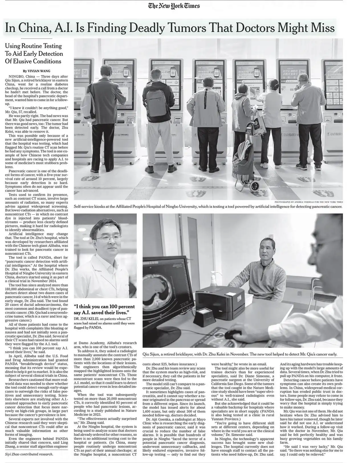 《紐約時報》發佈2026年首篇中國報道,題為《在中國,AI正在發現醫生可能漏掉的致命腫瘤》(In China, A.I. Is Finding Deadly Tumors That Doctors Might Miss),整版講述一個普通退休泥瓦匠的就醫經歷。憑藉最新的中國 AI 技術,他僅花費了約25美元就查出了早期胰腺癌。