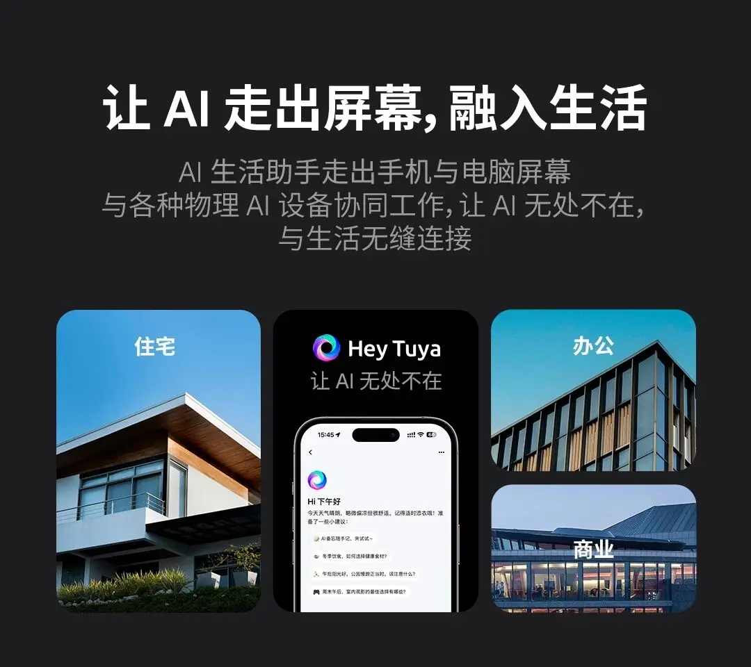 據介紹,Hey Tuya是基於Multi-Agent協同架構的生活AI管家,能走出手機與電腦屏幕,與生活中的各種物理AI(Physical AI)設備協同工作,並將實現超級智能體從家庭、辦公到户外空間的無縫協同與連接,在不同場景化身家庭安全守護者、節能專家、健康生活教練、辦公助理和生活秘書,主動在生活中為人類提供幫助。