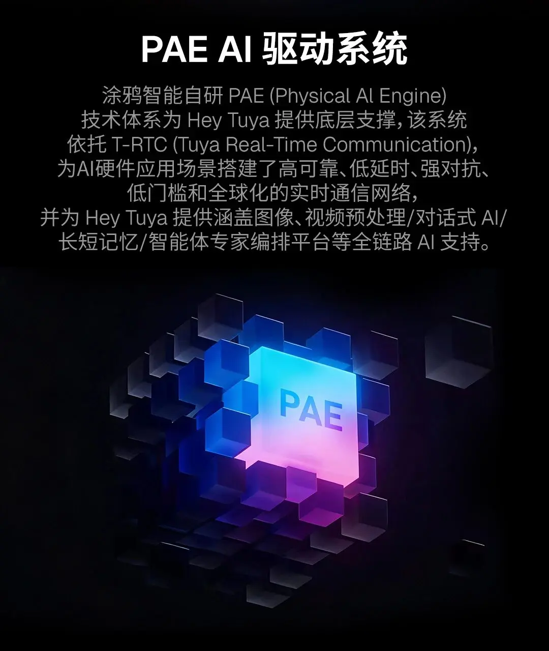 Hey Tuya核心由塗鴉自研的PAE(Physical AI Engine)驅動系統提供底層支撐。PAE部署了覆蓋全球主流地區的AI-Device Real-Time Network(AD-RTN)邊緣加速網絡,基於AD-RTN網絡,塗鴉構建了T-RTC(Tuya Real-Time Communication)一套高可靠、低時延、強對抗、低門檻的實時通信系統。