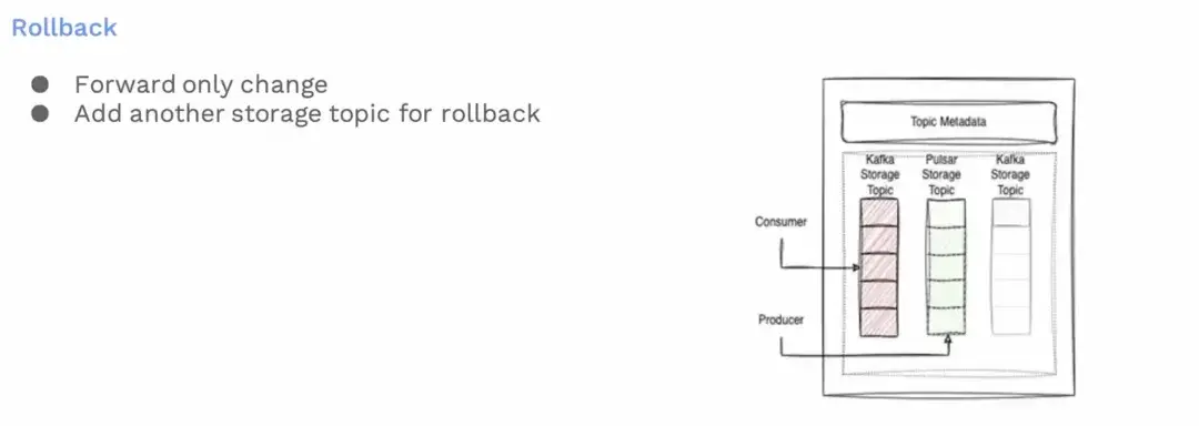 就故障回滾方面我們採取的策略,假設從 Pulsar 發現問題想要回滾到 Kafka,我們的策略規定不能回到之前的主題,而是必須添加一個新的 Kafka 存儲段,並且移動生產指針,或者從 Pulsar 重新遷移一次到 Kafka。這是必要的,我們不能重複使用同一主題。我們本可以將指針從 Pulsar 移回例子中的Kafka 主題一,但這意味着 Pulsar 主題中的消息將被錯誤錯亂,從而導致我們的用户遭受順序性方面的損失。