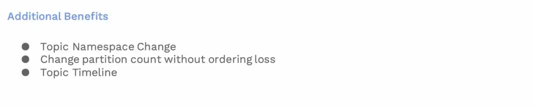 我們通過這種遷移策略獲得了一些額外的好處。例如,我們現在可以更改主題的命名空間,這在 Pulsar 中本來是不可能的。我們甚至還可以利用這一特性,將主題從一個命名空間遷移到另一個命名空間。我們還可以在 Pulsar 中更新主題的分區數而不會失去消息的順序性。這是目前任何消息隊列都不能提供的。