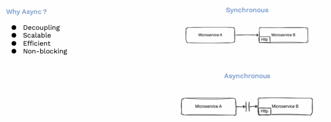 在同步操作中,服務 A 通過 HTTP 連接到服務 B,並等待其響應,直到服務 B 完成請求的處理。然而,這種方式並不可擴展,因為存在阻塞,並且與服務 B 緊耦合。這就是為什麼我們使用異步處理:在異步處理中,服務 A 將請求發往服務隊列,然後繼續執行自己的任務,不會等待服務 B 的響應。服務 B 可以自行決定處理時間,甚至可以延遲處理。這意味着兩個服務在職責上是解耦的,它們可以獨立地擴展,並且效率高,不會發生鎖定。