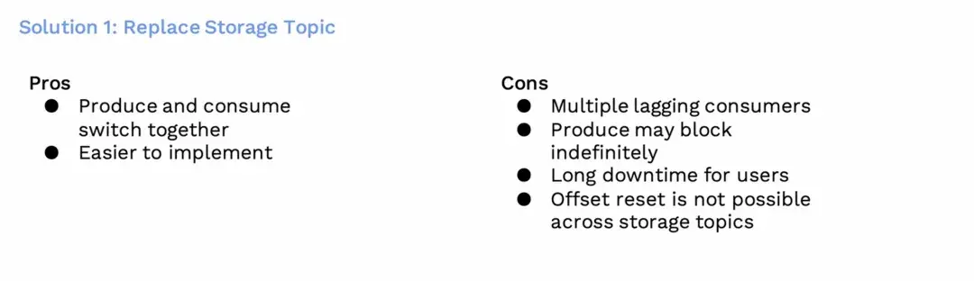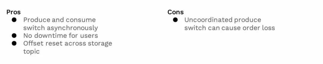 這個方案的優點是生產者和消費者可以同時進行,這意味着用户的順序性得到保留。任何生產出的消息將會以產生的順序被消費,因為遷移沒有帶來這方面的改變。而且方案很容易實現。然而,也有一些不利因素,由於這些原因,我們無法繼續採用這種方法。其中之一是,我們可能會有多個消費者對應一個生產者,一旦其中有消費出現延遲的,就會使我們的生產停機時間變得很長,這是我們不希望讓用户經歷的。另外,偏移重置不可用,你不能將你的消費指針回退到 Kafka,即使用户已經為該主題設置了某種保留策略。那時候,我們將不得不丟失那些信息,這對我們來説可能是不可接受的。